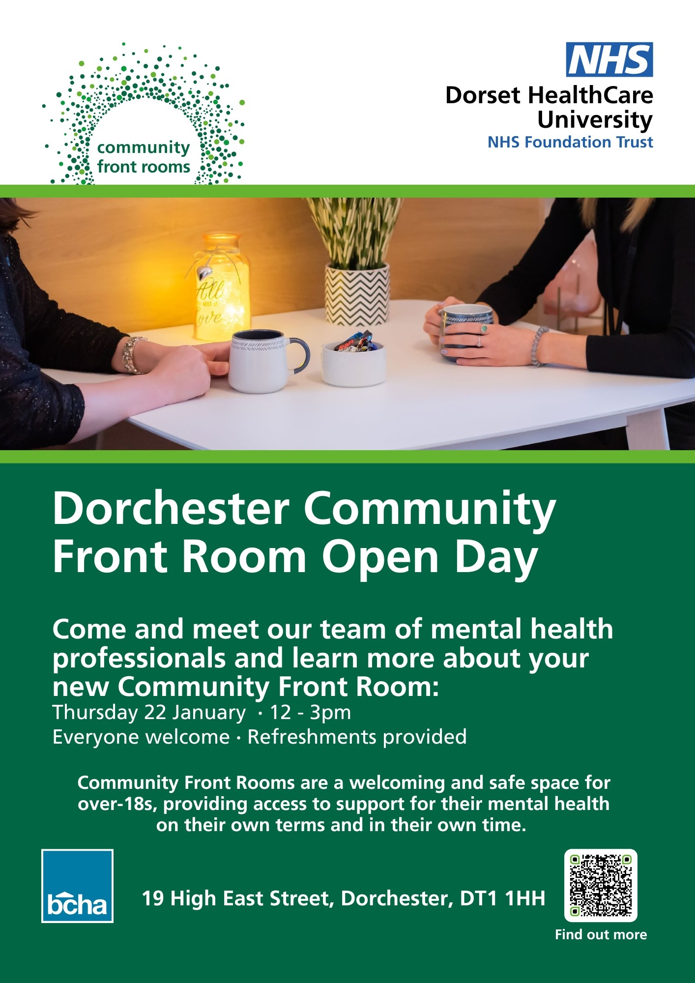 All Community Front Rooms (CFRs) will continue to be provided by BCHA, working in partnership with Hope – for the Shaftesbury CFR, and Burrough Harmony – for the Bridport CFR. And The Retreats are run by Dorset HealthCare (DHC), in partnership with Dorset Mental Health Forum.